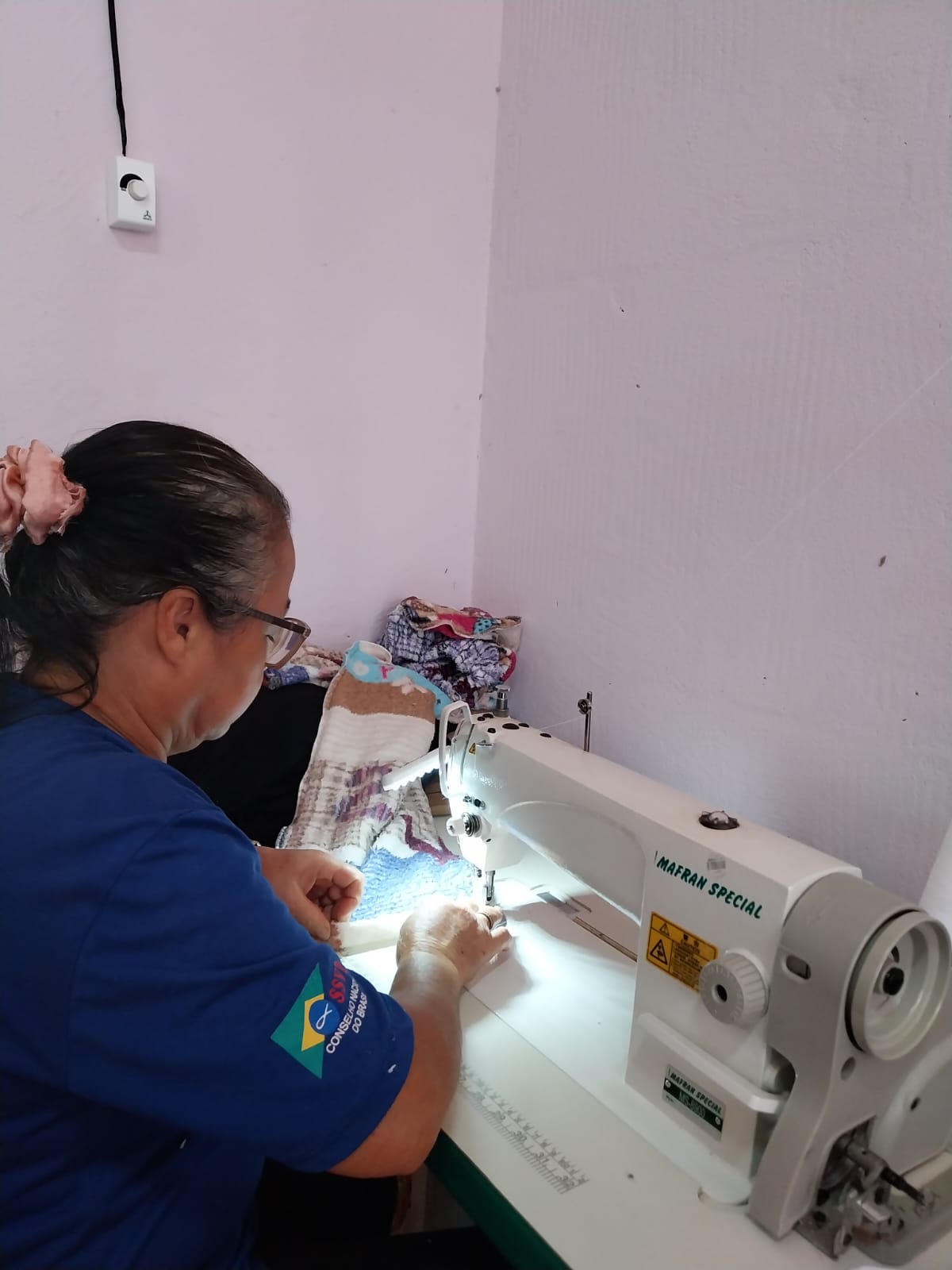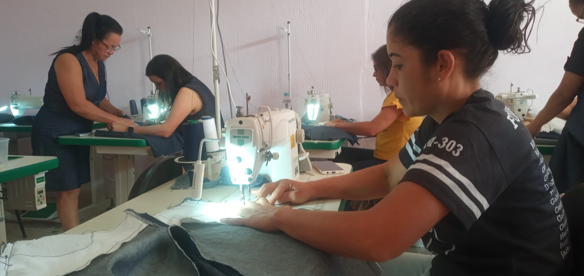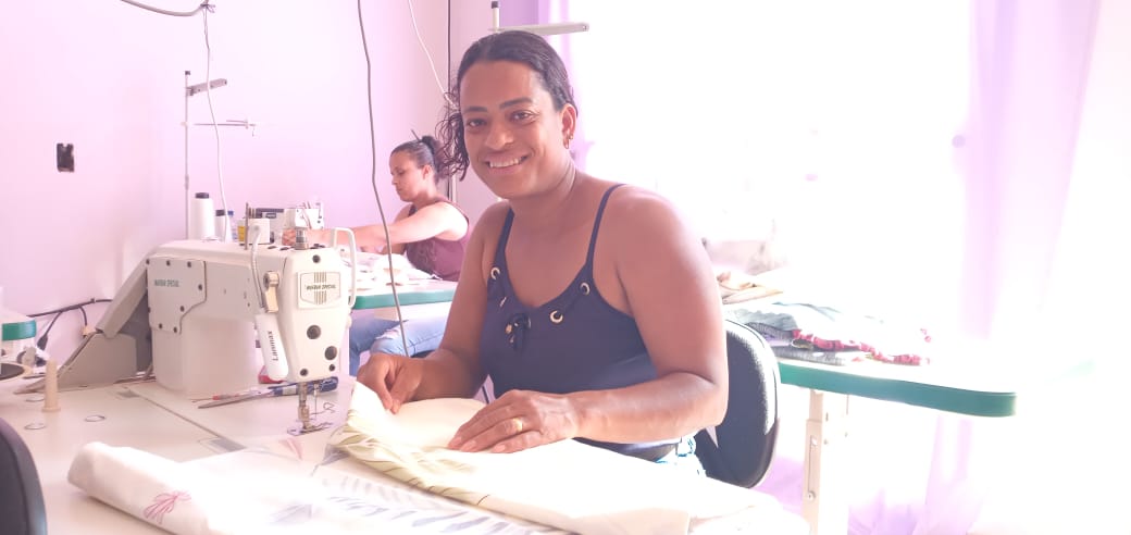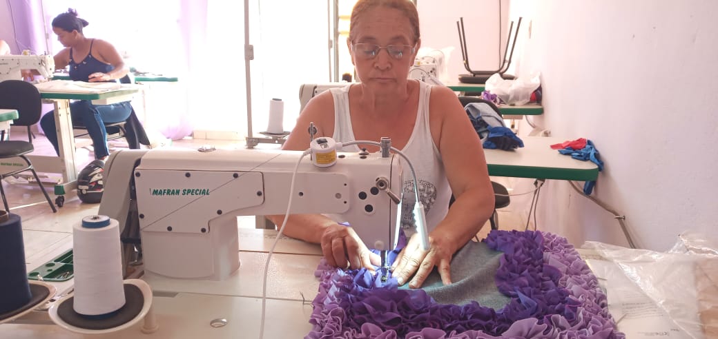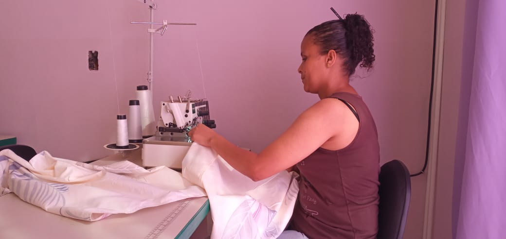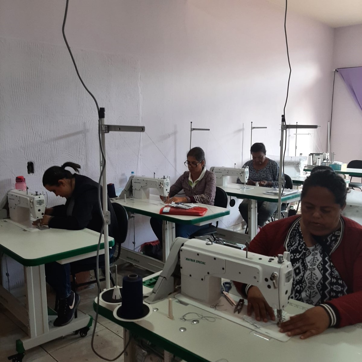 O segmento principal da célula é a produção de uniformes, atendendo a demandas locais. Além disso, o grupo realiza ajustes, confecção de peças femininas, moda casa (como fronhas e lençóis) e tapetes de retalhos de malha. A produção de tapetes é direcionada para venda nas Feiras da Agricultura Familiar, enquanto os serviços de ajustes e customização (upcycling) são realizados tanto coletivamente quanto de forma individual pelas beneficiárias. A divisão dos lucros é feita por trabalho, e a compra de insumos é organizada de forma coletiva.