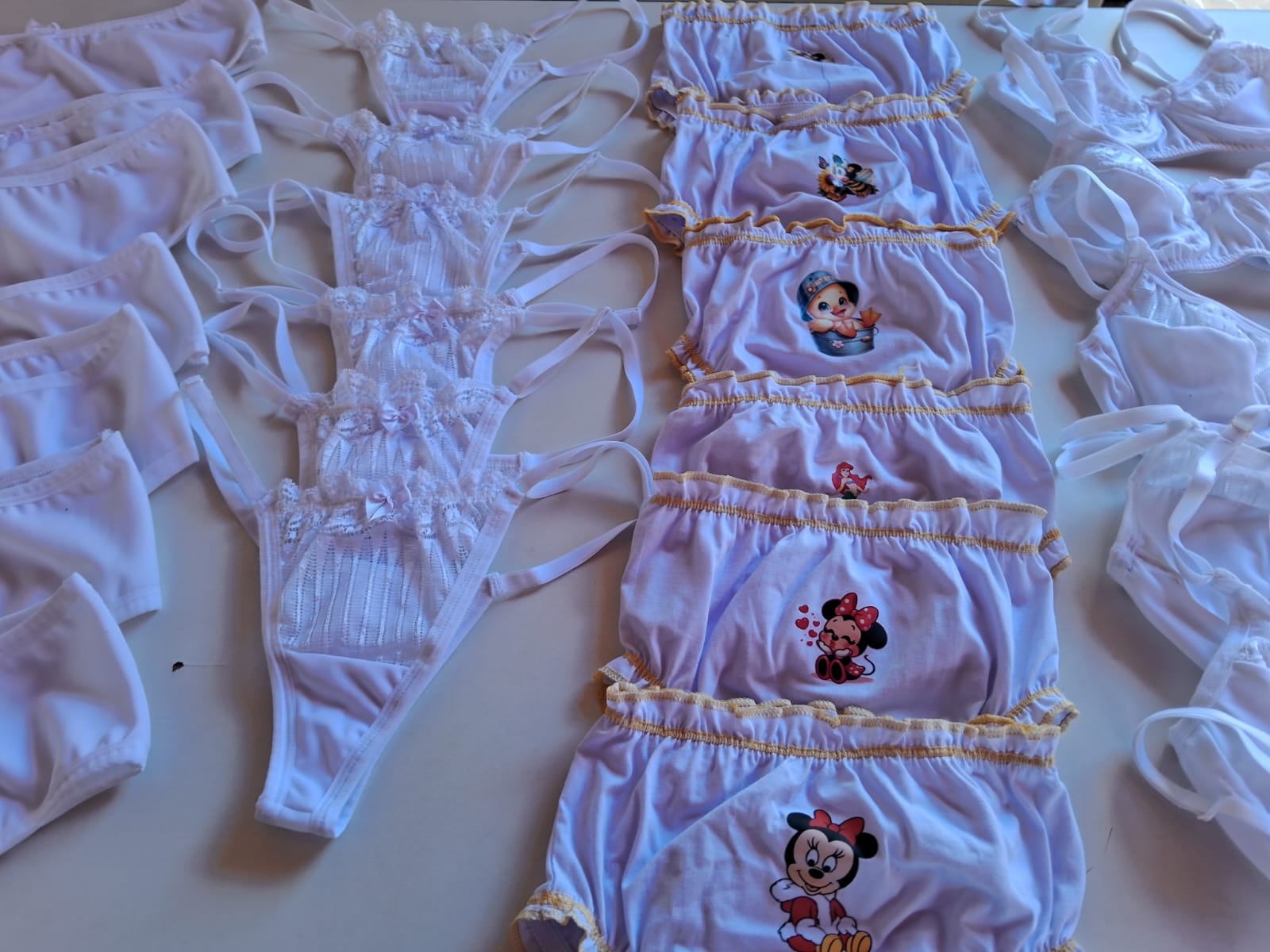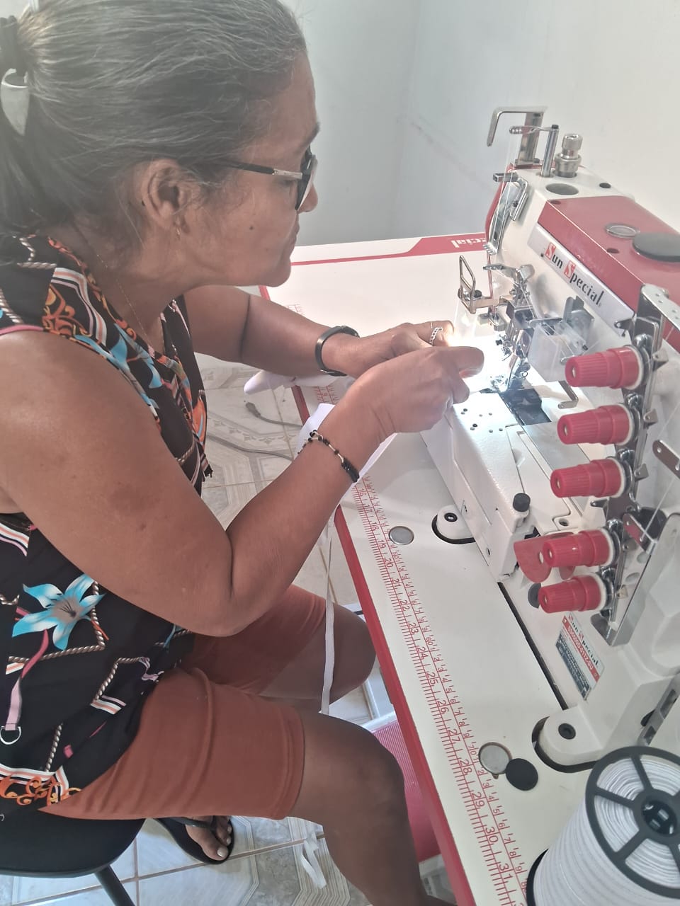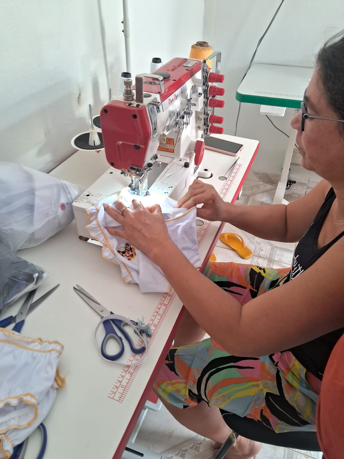 O segmento de moda escolhido pelas participantes é a Moda Íntima, com foco na produção de peças direcionadas a esse nicho. Uma das beneficiárias, que já possui experiência prévia na área, atua como referência técnica para o grupo, contribuindo de forma significativa para o fortalecimento da confiança e o aprimoramento das habilidades das demais integrantes.